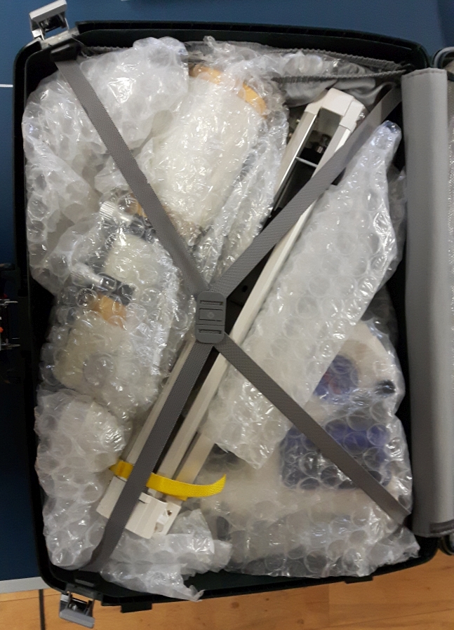 Min 10cm refraktor (utan lins), lättvikts stativ o Vixen Sphinx fick åka i extra väskan. Lins, kamera, dator, okular mm fick spridas ut på övrigt bagage. Man fick ta med 23kg+10kg per person så det var inget större problem. Batteri + en 1l vattenflaska fick vara motvikt.