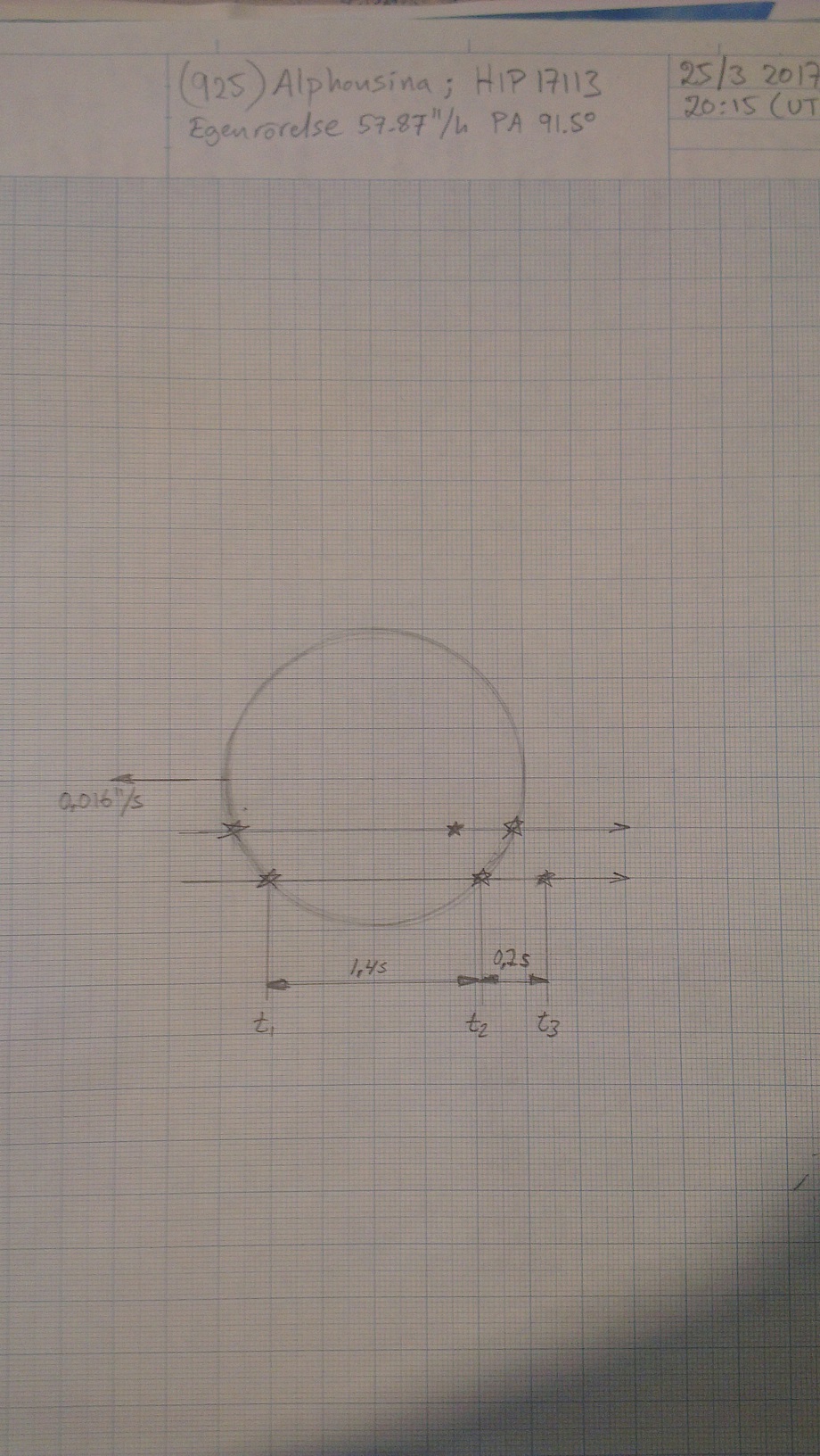 Du kan ha rätt. Inser nu att jag hade helt fel i mitt resonemang ovan om tidsupplösning. Det intressanta är ju Alphonsinas vinkelhastighet och hur lång tid det tar för den att röra sig samma vinkel som dubbelstjärnan uppvisar. Kollar på detta ikväll.