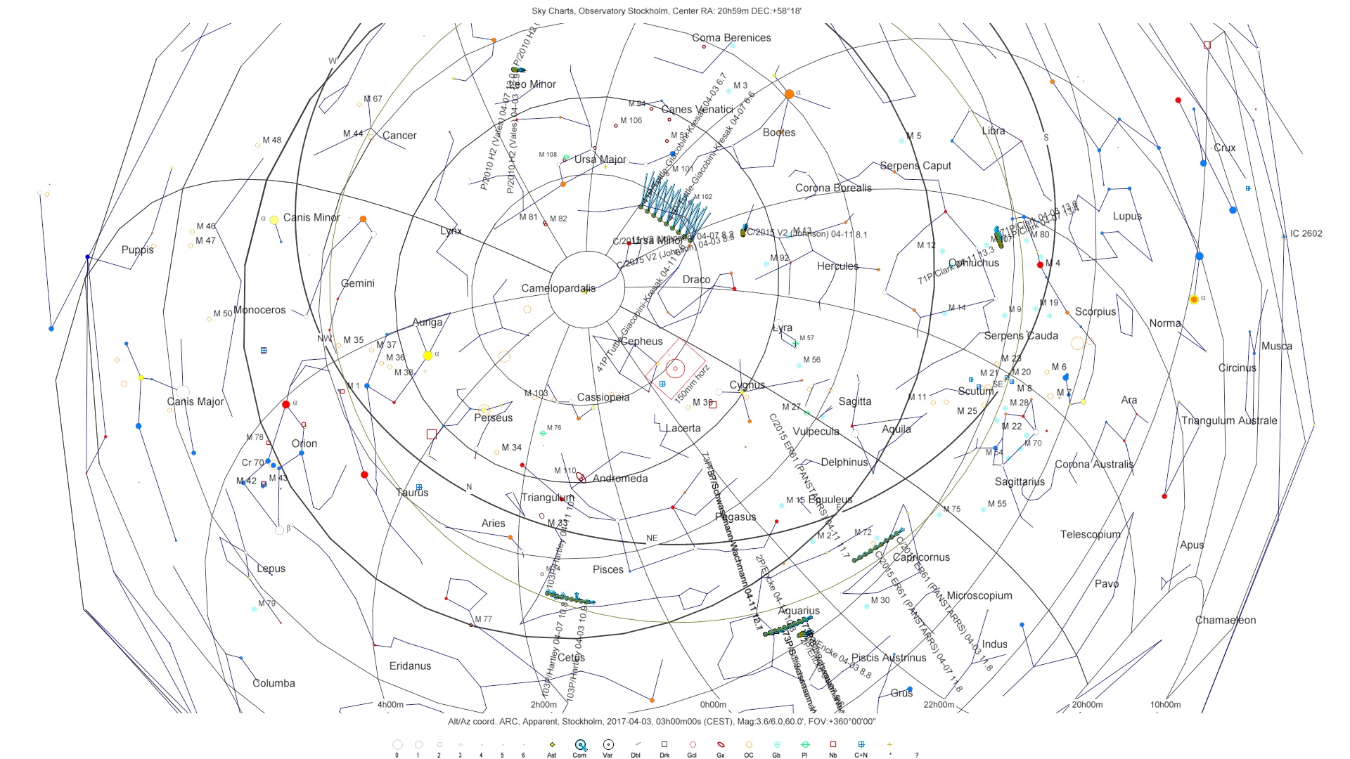 Här är kartan för kvällen med de nämnda kometerna, kvällen ca kl 21.