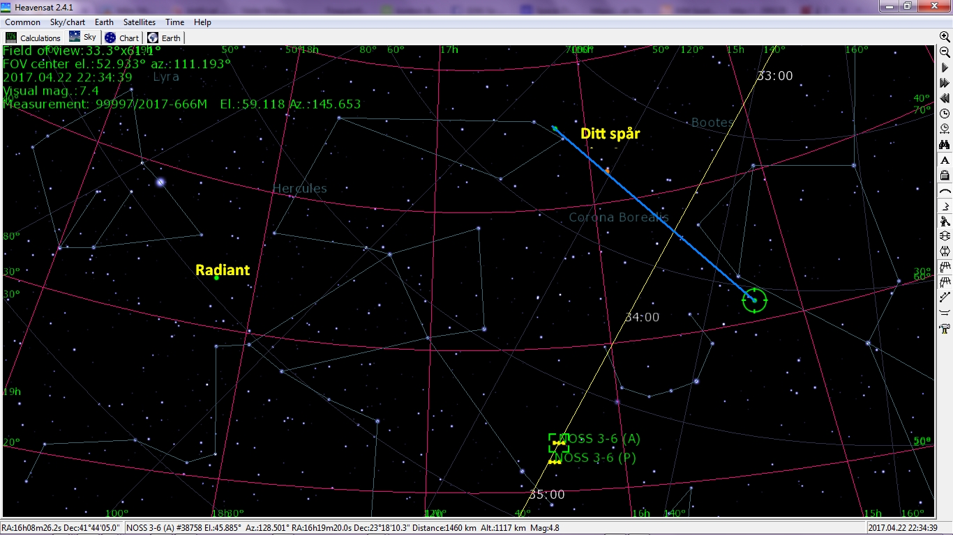 Jag tittade igenom de trådar du skrivit om Lyriderna, men kan inte hitta någon radiant karta. Fisheye objektivet förvränger ju en del av perspektivet, tyckte ju att den starka meteoren på bilden tycktes komma från Lyriderna, men har ju så många gånger tidigare tagit fel. Får se, den kanske senare också nedgraderas från meteor till satellit av Björn Gimle :-)