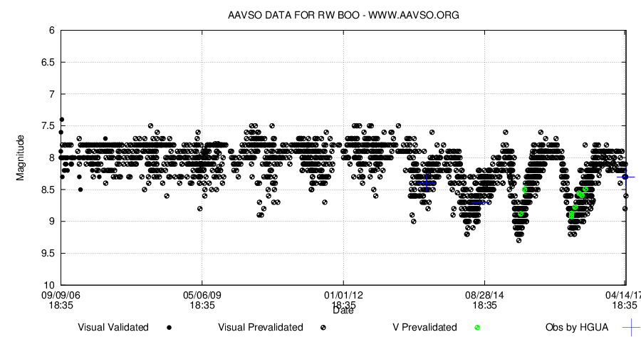 RW Boo är en halvregelbunden fältkikarevariabel som jag bara har observerat ett fåtal gånger, nu senast i förrgår kväll då jag skattade den till 8.3. Men stjärnan verkar ha ett ganska spännande beteende. Tittar man på AAVSOdata ser man en stjärna som de senaste tre åren eller så fått en ökande amplitud. Lite som V Boo, som också ökat i amplitud på sistone.