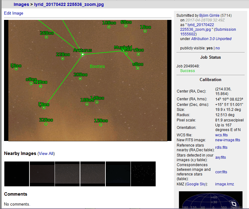 Björn Gimle har analyserat mina bilder från Lyridnatten och jag förmedlar hans information här, han fick mycket att göra för jag såg satellit spår på över 60 st av dom: