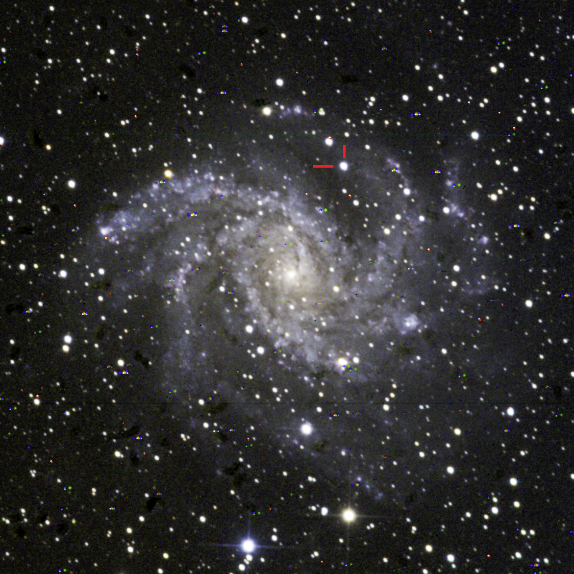 Här kommer en bild av supernovan i NGC6946 som Christian Sasse tog och vars exponering han programmerade medan jag Skypade med honom i onsdags. Bilden är tagen med ett av hans 17-tums Planewave-teleskop i Spanien igår morse 18 maj klockan 4h UT. Exponering 3x5 minuter i RGB (tror jag). Kul att se när han online knappade in önskade exponeringsdata mm. Såg så enkelt ut.