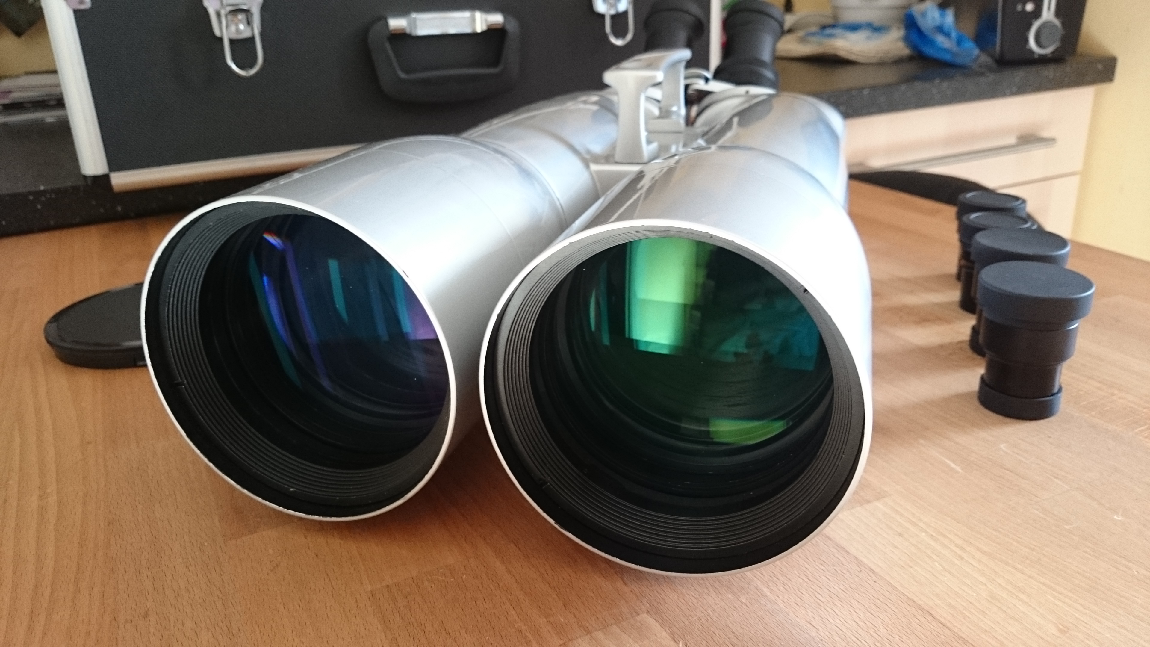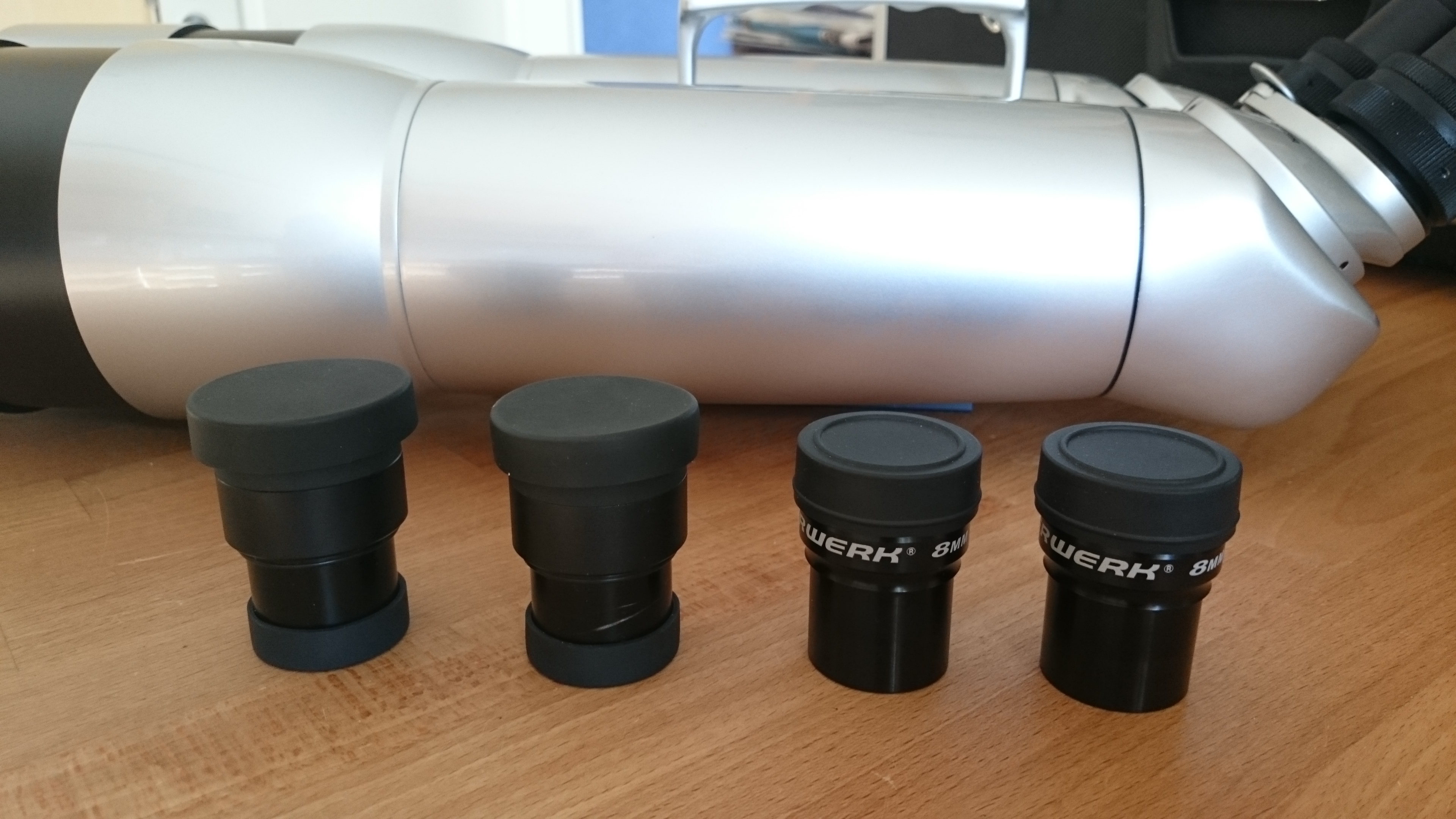 Säljer en stor observationskikare av modell Quantum-5 20/40-100. Den passar bra både för natur- och astronomiobservationer och har rejäla utdragbara dagghuvar till objektiven. Observera att du behöver ett bra stativ. Vikten ligger på ca 7kg. Det finns 2st 1/4-20 gängor men jag inkluderar en dovetail/laxstjärt för montering på astrostativ (se bild). Kikaren tar vanliga 1.25" okular. Det följer med 2 par originalokular av bra kvalitet som ger 20 resp 40x förstoring. Jag skickar även med 1 par Oberwerk 8mm okular som ger 70x förstoring och är bra för tex. månobservationer. Allt är i bra skick och ca 2 år gammalt. En av de uppvikbara gummikåporna till 20x okularet har en reva men det påverkar inte funktionen. Borde lätt kunna limmas. Förvaringsväska följer med.