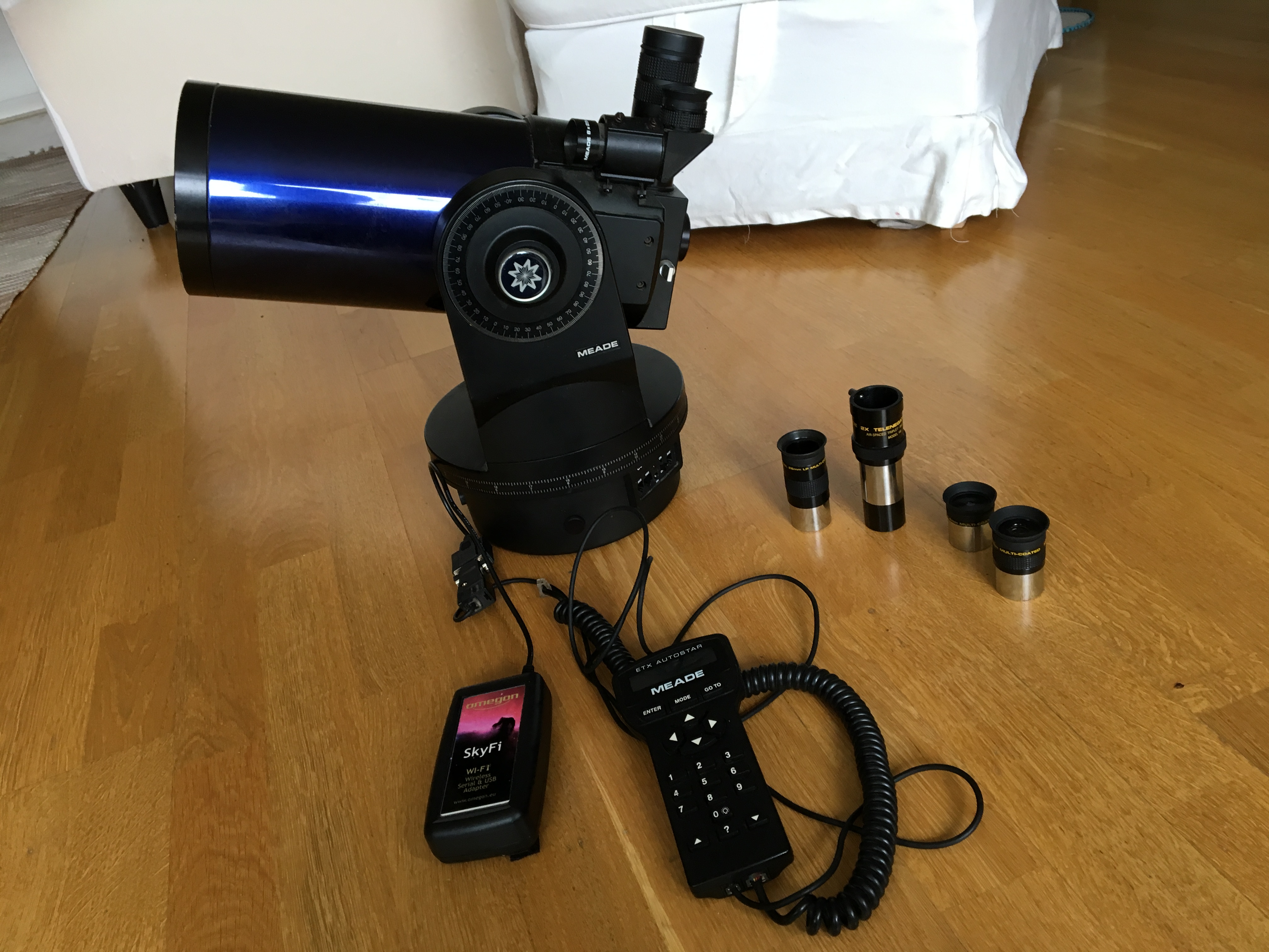Säljer en Meade ext 125 inklusive stativ + transportväska, inkluderar linserna; wide angle 13.8 mm, Meade super plös 6.4 mm + 26 mm, Telenegative amplifiera, Air spaces Triplet model 140 och en EXT autostar fjärrkontroll + sky wifi.