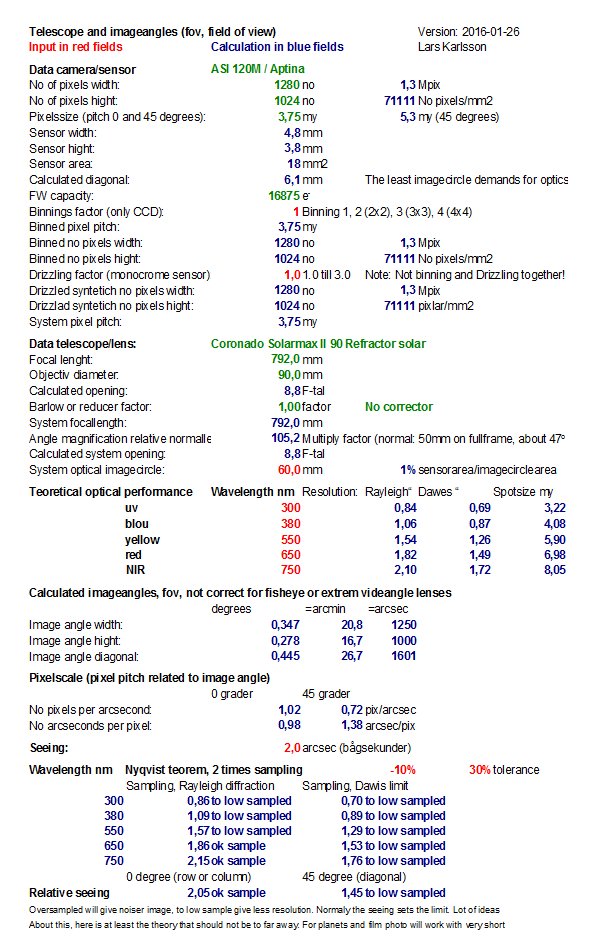 Behöver då fokallängd och f/tal på ditt teleskop. Har ingen egen erfarenhet av solteleskop, men borde vara lämpligt med en Barlow för att få upp fokallängden och därmed inte kräva extremt små pixlar för att få tillräcklig upplösningen. Fast borde ju redan vara inbyggt i konstruktionen. Om man får problem att få tillräcklig lång fokallängd kan man ev använda Drizzle teknik i stackningsprosessen för att få tillbaks upplösningen från ett undersamplat optiksystem.