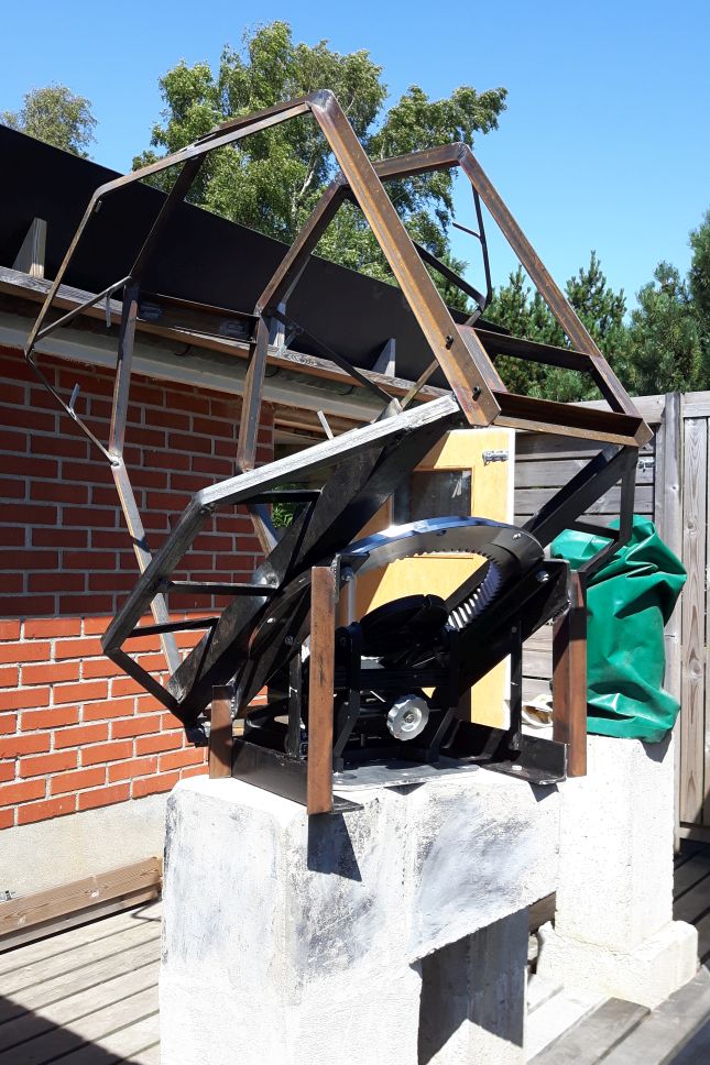 Så här långt har jag kommit i bygget av en ekvatorial monterad dome för min gaffelmonterade rcx12a. Den är 1,1m i diameter o 1.3m hög. Vad som återstår är glasfiber laminering och två baffel väggar (ca 30cm djupa som monteras på skenorna som går länga spaltöppningen). Teleskopet (i nedersta bilden) kan röra sig fritt (med ca 10cm marginal) inuti och domen som självständigt följer dess rörelse i ra. Växellådan ger en utväxling på 1:230 och kommer med stegmotorn klara ca 2rpm (med ca 300Nm).