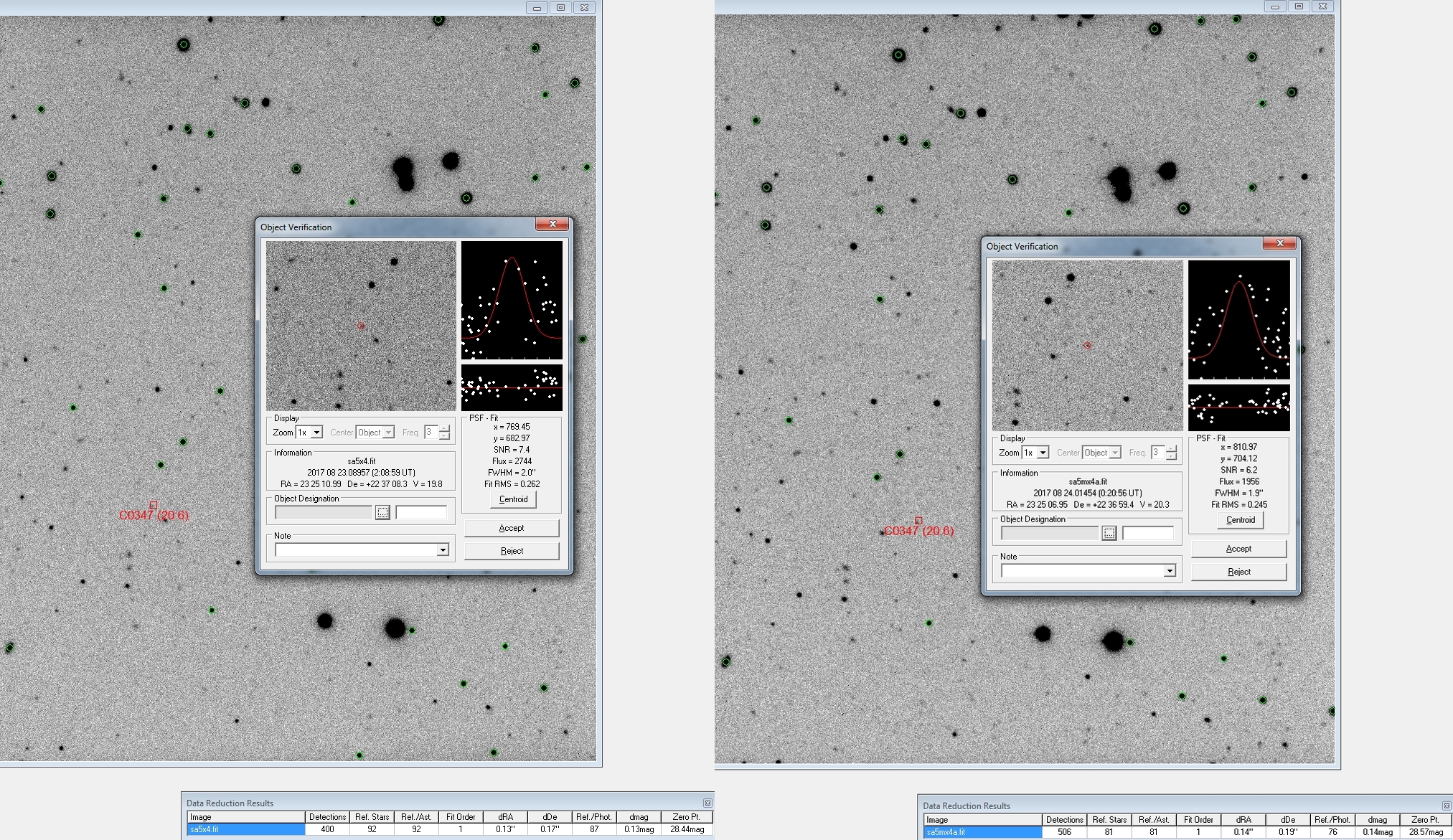 Här kan ni se dess förflyttning på ett dygn. Det var mycket disigt när jag tog bilderna och kombinerat med att den har en rödaktig färg så blir magnitud mätningen fel då jag inte använt något V filter.