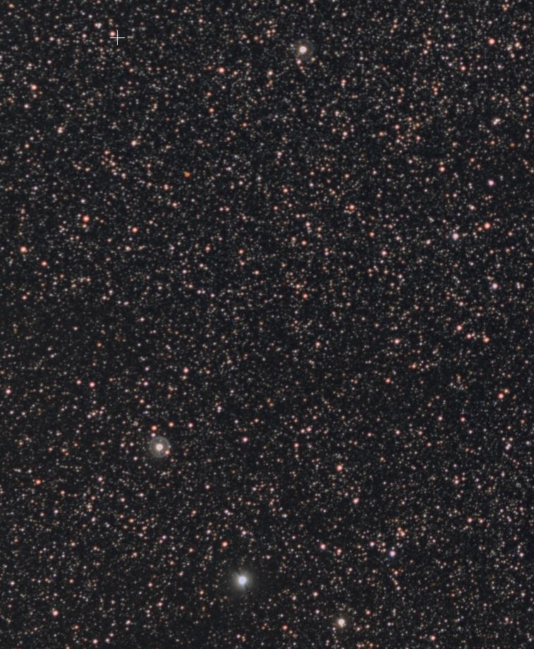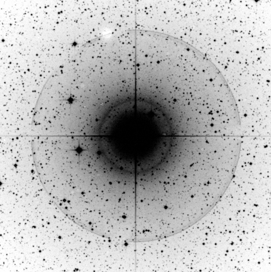 En stjärna som tittar fram då och då till vänster om den stora stjärnan en bit mot kanten, närmast och runt den stora stjärnan syns olka difraktioner pga olika plåtar känsliga för blått och rött, ringen längst ut är en svag bild av omgivande gasskal, minns inte vilken plåt den var tagen med.