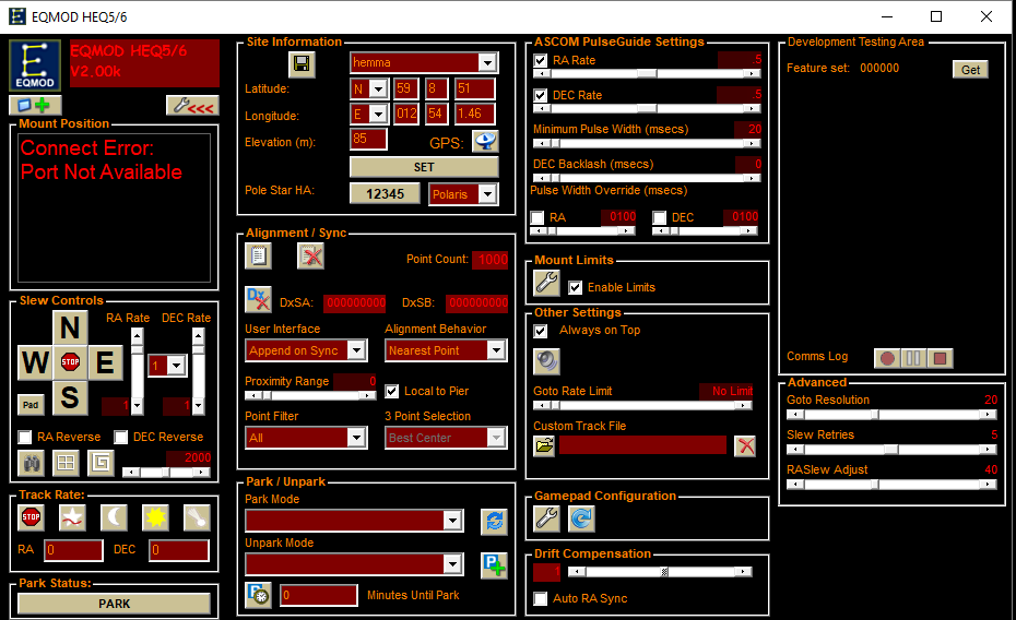 Jag gjorde själv lite provkörningar på balkongen ikväll. Har bland annat uppdaterat EQMOD till ver 2.0 som du också har. Ser att rate värdena ställde sig på 0.2, det hade jag inte innan. Fick också larm om att axlarna inte var ortogonala, så här lär det bli felsökning.