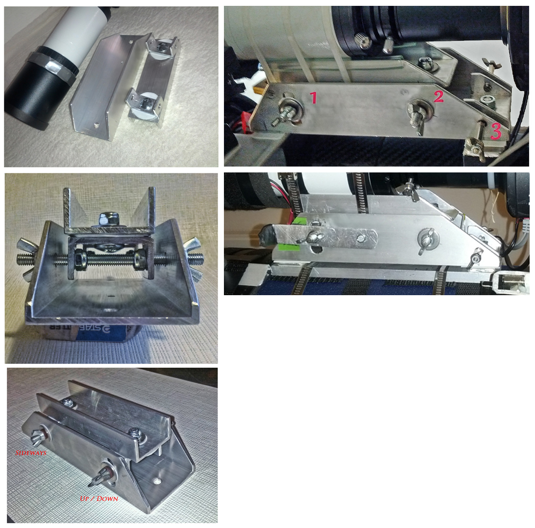 EDIT: glömde nämna att jag kompletterade med ett index (spetsig plåtbit) plus en skala (tejp med streck på) för att ha koll på var centerläget i sidled är - man ser det lite grann på nedre högra bilden. Gjorde även markeringar för höjdledsjusteringen (grön tejpbit i samma bild) så att jag vet ungefär var läget är som motsvarar centrum i teleskopets kamera.