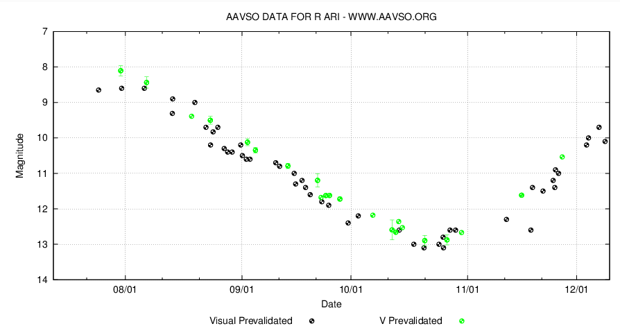 Vill uppmärksamma er att R Ari är på väg upp i sin ljuskurva och har redan passerat mag 10. R Ari en intressant Mira med en ganska så kort cykel på ca 185 dygn och med maxima på ca 7-8 mag. R Ari befinner sig bara 2.5 grader öst från Hamal (alfa Arietis), är mycket lätt att hitta, och dessa dagar ligger ganska nära meridianen mot söder tidigt på kvällen. Antagligen är vi nära en beräknad maximum (2017-12-25 enligt SVO). Inga observationer verkar ha lagts i SVO sedan i februari-mars (ANC, KAR). Jag ska se till att göra några obsar när tillfället dyker upp.