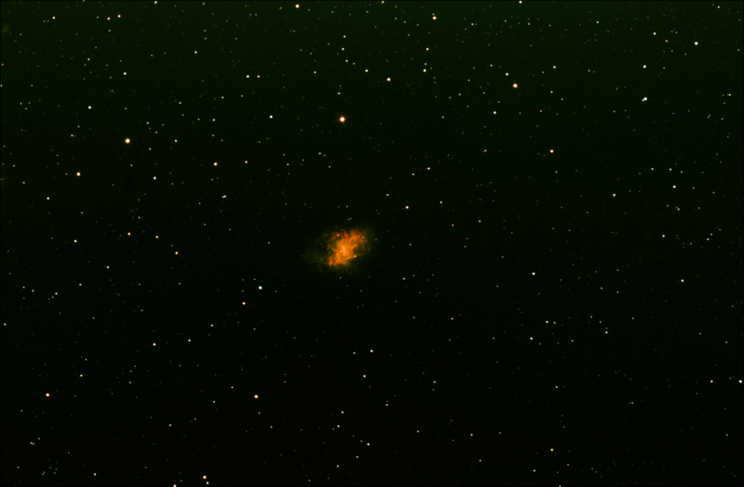 Kikade på din krabba. Det är nog bara att dra lite i färgreglagen, men när du skall få fram detaljer i M1 och samtidigt ha stjärnorna snygga blir det mer avancerad. Om man struntar i stjärnorna och koncentrerar oss på M1 är det bra ösa på med ca 150% extra blå och 100% grön så blir det så här.
