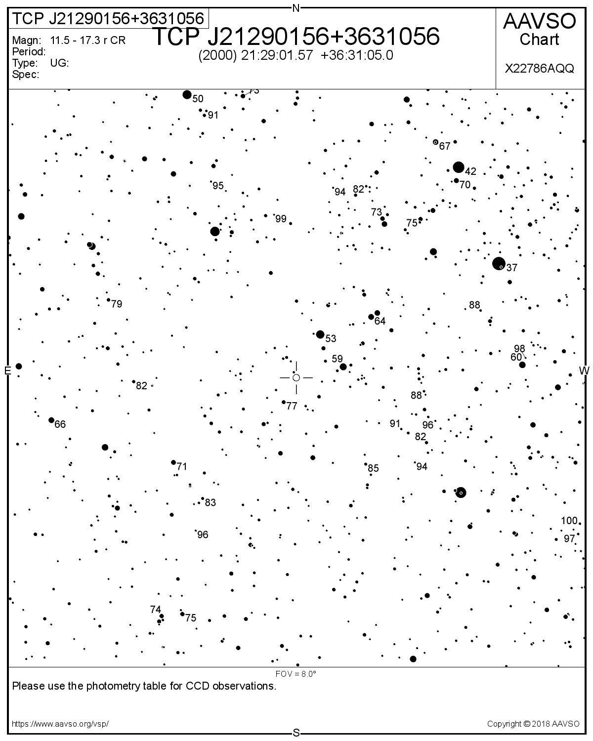 Magnitudsekvens finns redan nu på AAVSO VSP. Kartorna nedan har utsnitt 8x8 grader, 2x2 grader, 30x30 bågminuter och 10x10 bågminuter. Norr är uppåt.