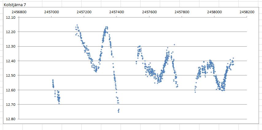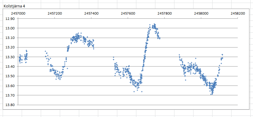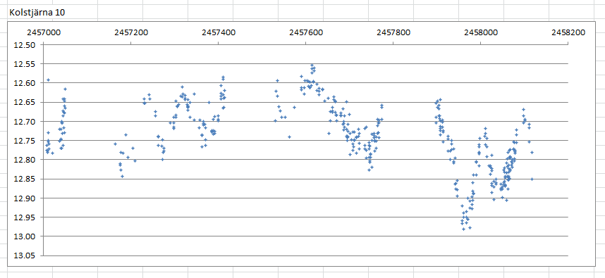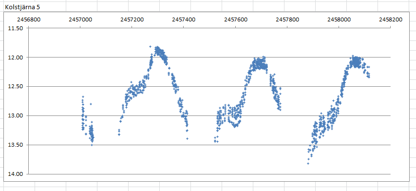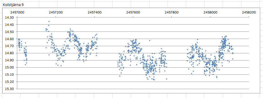 Jag lade sedan in txt-filen i Excel och sorterade där bort alla stjärnor som i katalogen har GCVS- eller NSV-namn (dessa är ju redan upptäckta). Återstår således en fil med kolstjärnor som i många fall redan finns med i VSX, men som ibland inte finns där och således är öppna för upptäckt. Om du vill så kan jag skicka dig en batch med t.ex. 100 stjärnor från den filen. Viktigt att vi inte gör dubbeljobb.