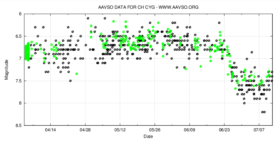 CH Cyg har minskat snabbt (7.8 i natt) och med anledning av detta har AAVSO gått ut med Alert Notice 639; observationer efterfrågas, såväl digital fotometri som visuella skattningar.