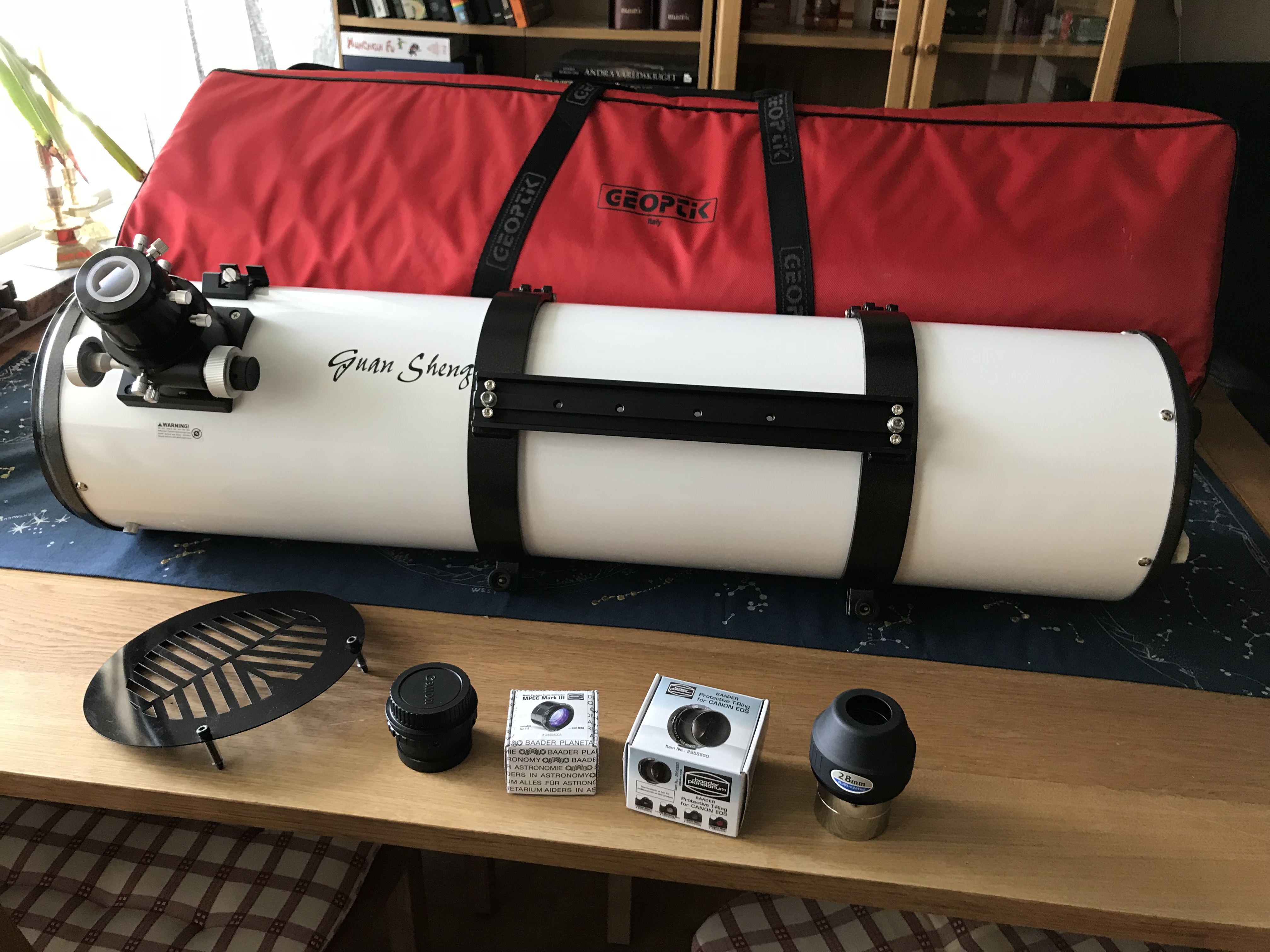 8" Newton från GSO med 2 tums fokuserare. Knappt använd. Nästintill nyskick. Stora justerskruvar för kollimering av primärspegel. 12V fläkt. Dubbla vixenskenor för ökad stabilitet. Ny Geoptikväska. Baader MPCC Mark III Coma Corrector. Baader Protective EOS 48mm T-ring. 28mm 2" okular. Bahtinov mask till fokusering.