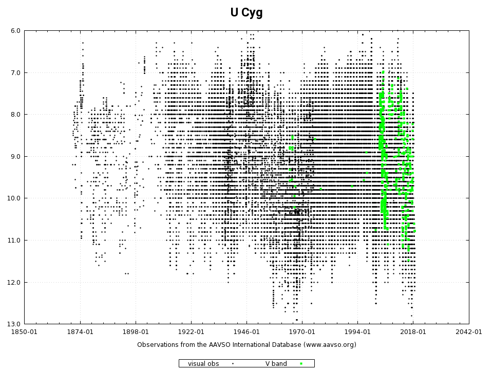 Hej! Jag satt och tittade lite på U Cyg ljuskurva av ren nyfikenhet, i väntan på att stjärnan skulle nå en ljusstyrka inom räckhåll för mina instrument. Jag konstaterade då att näst sista minimum har varit ganska ljussvag jämfört med andra de senaste få åren. Man måste gå tillbaka till ~1967 för att se en nästan lika ljussvag minimum. Å andra sidan verkar det som att kring 1995/6 inträffade en motsatt situation, med en ganska ljusstark minimum även kopplad med en maximum på nästan mag 6. Detta var mycket intressant. Finns det en sekundär period på ca 40 år för denna stjärna?