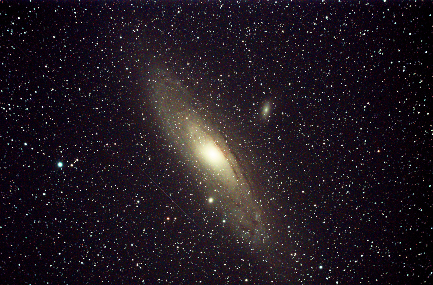 Kommentar: Ytterligare en bild på den magnifika Andromedagalaxen. Tagen med enkla hjälpmedel, snabb bildbehandling och en hel del genvägar på grund av omständigheterna. Fotad strax efter bilden på 46P/Wirtanen (http://astronet.se/view_image.php?id=5641" onclick="window.open(this.href);return false;) under en glugg i molntäcket som varade ett par timmar. Ingen flat, dark eller bias använd. Stackning och logaritmisk skalning i Maxim DL, behandling med nivåer, kurvor och mättnad i Photoshop. Tagen med William Optics minsta 66 mm APO, 0,8x FR/FF, QHY8 CCD-färgkamera och Astronomik CLS-filter, piggyback på en LX200 utan guidning. Transparent mörk himmel. Exponeringstiden i kortaste laget på grund av moln. Jag har låtit spåret av en roterande satellit vara kvar. Bilden visar hela fältet från kameran med 2x binning.