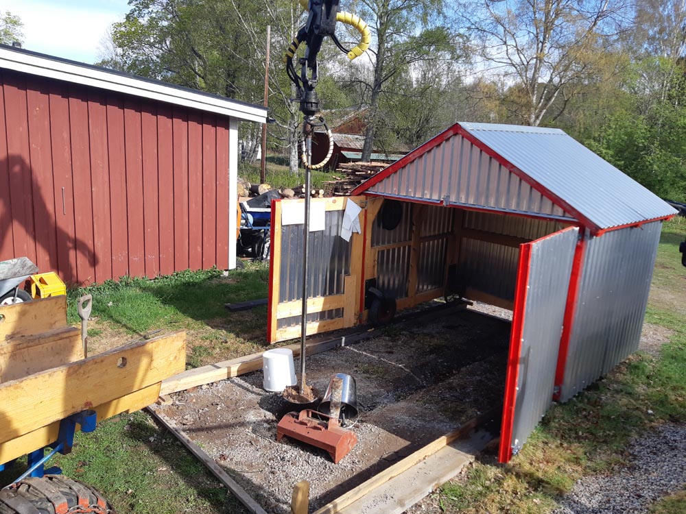 En galvad plåt 1x2 m nerstucken i hålet. Skulle helst varit rullbockad med firman hade inte så stora maskiner.