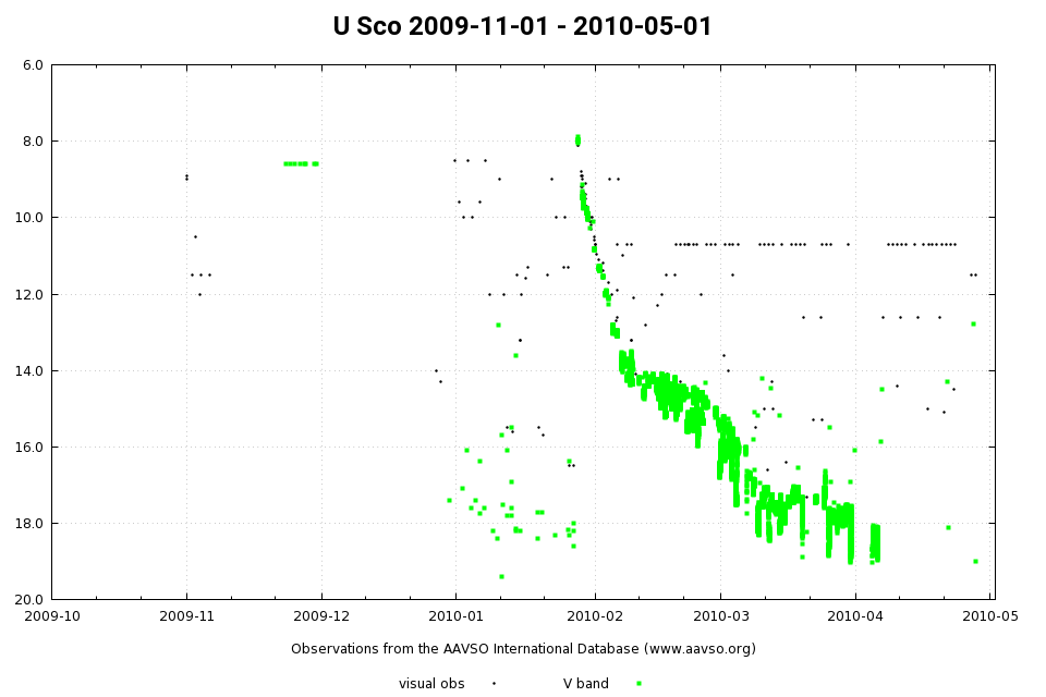 AAVSO har släppt en notis (Alert Notice 664: Monitoring recurrent nova U Sco to discover its imminent eruption) där man vädjar observatörer att börja med tätare observationer av den rekurrenta novan U Sco inför nästa utbrott. Utbrottet förutspås ske inom kommande 12 månaders period men tycks kunna ske i princip när som helst. U Sco ligger vanligtvis kring mag 18, men kan gå upp mot 7.5 vid ett utbrott.