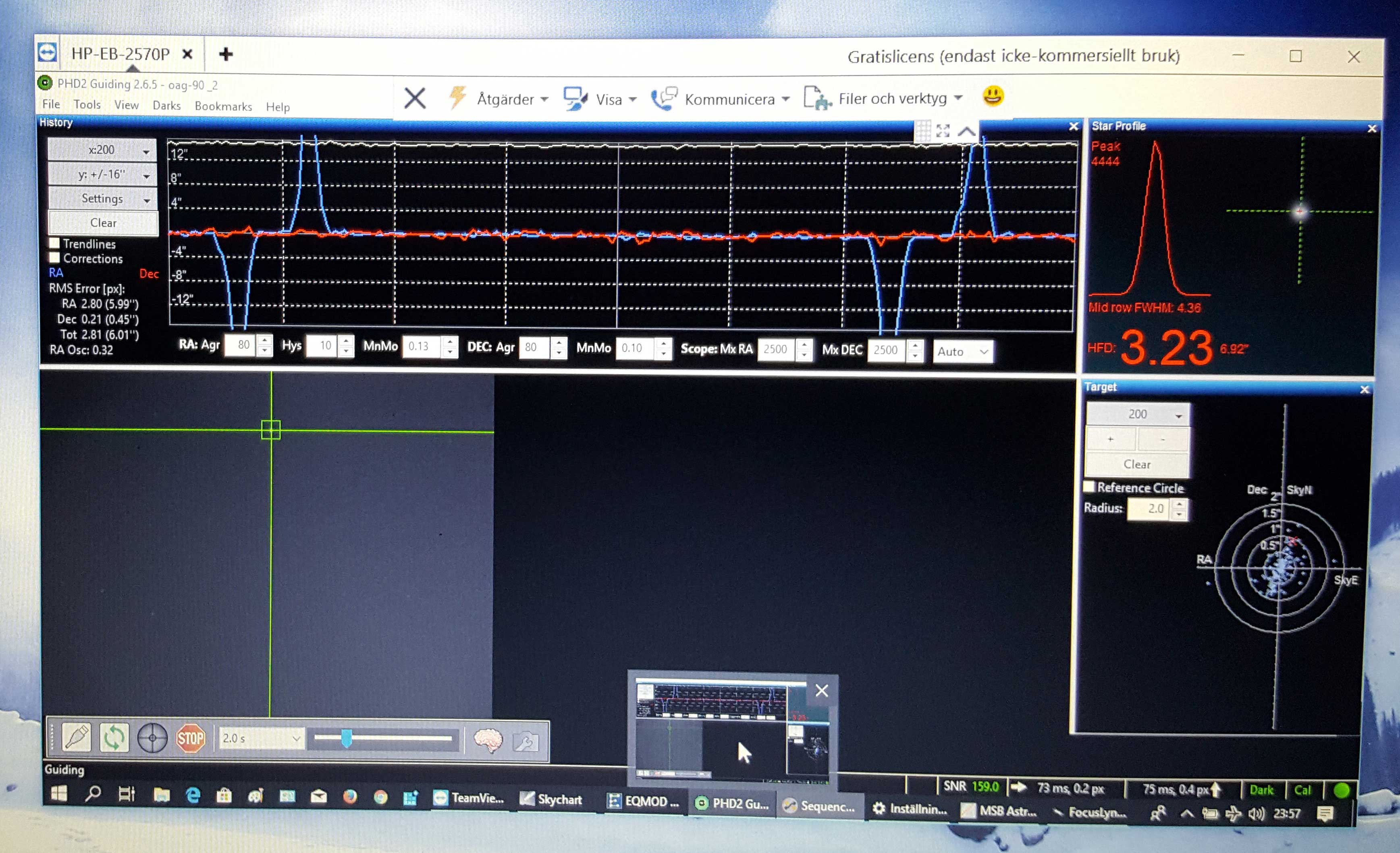 Det har ju varit fantastiska nätter nu ett tag om man fotar med Ha, fast seeingen varierade ganska mycket igårkväll. Men om man skall kunna utnytja bra seeing <2 måste guidningen vara mycket bra för att inte påverka resultatet.
