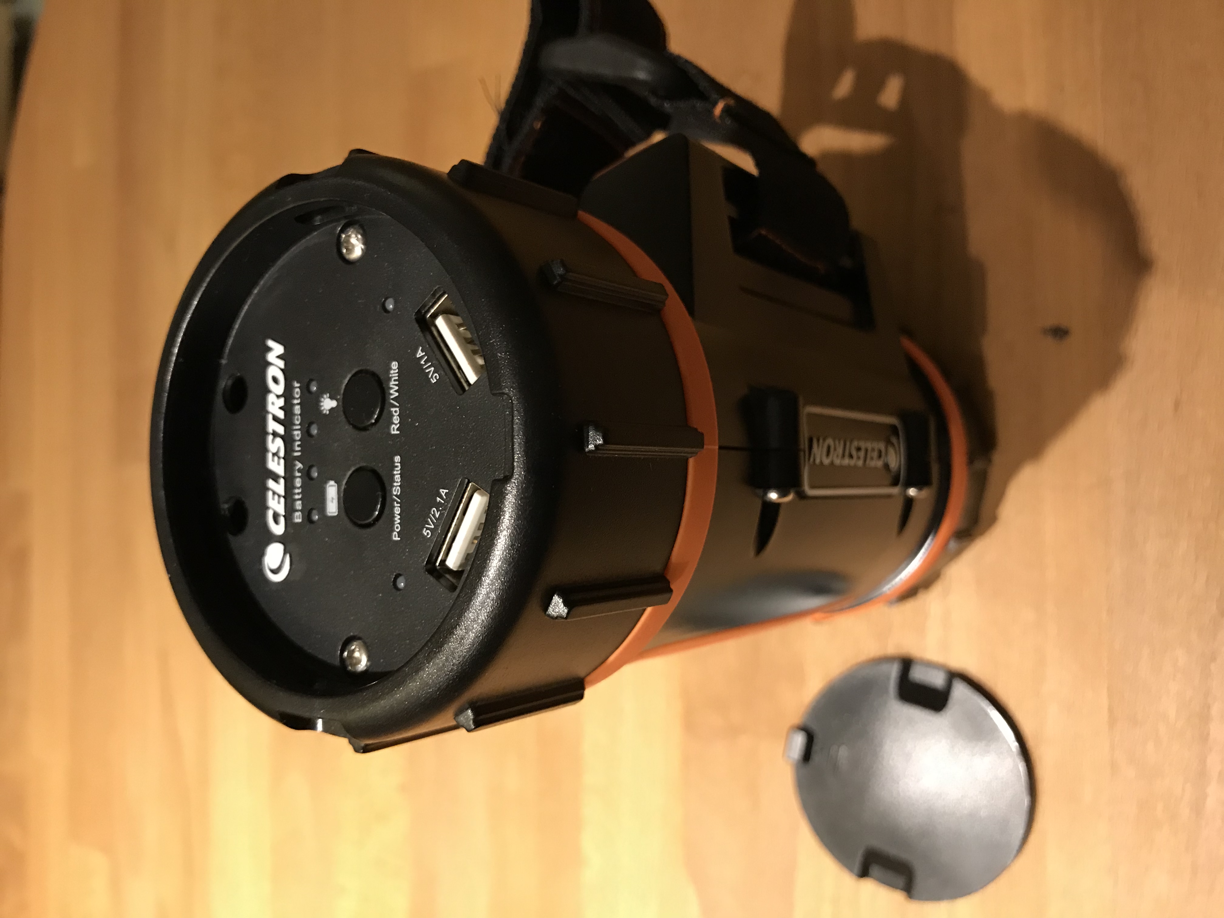 Uttag: 12 V uttag med standardkontakt som passar till de flesta teleskop. 2x USB uttag.