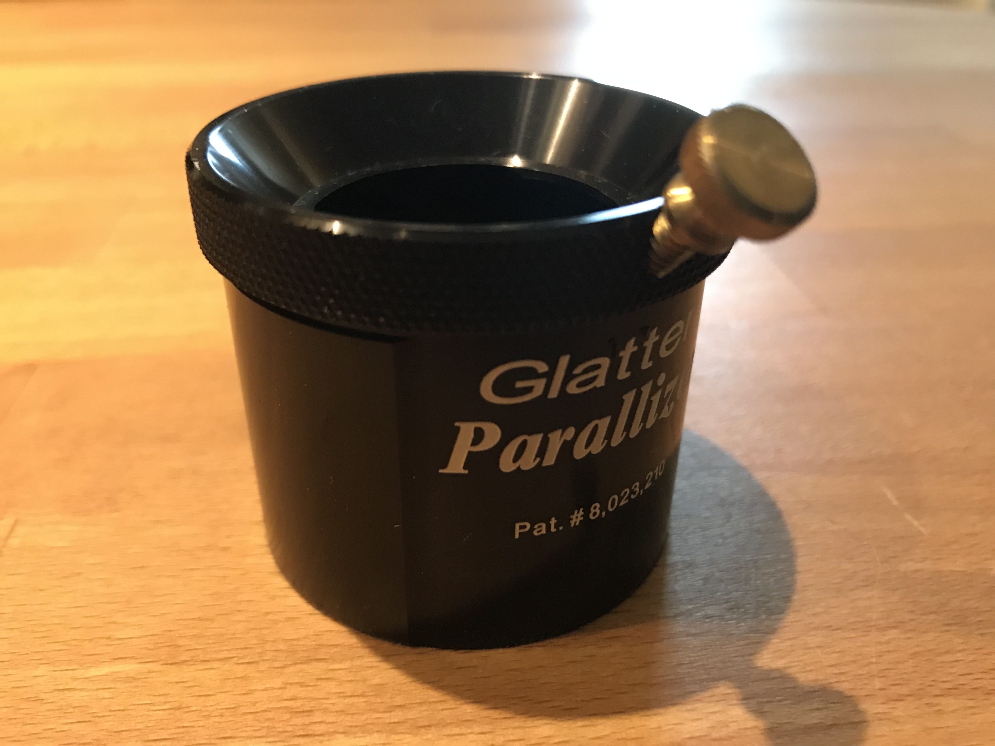 The Howie Glatter Parallizer 2-till-1¼-tum adapter centrerar okular, kollimeringsverktyg, kameror etc så att de är parallella med optiska axeln och kan uppnå optimal skärpa. Mer info finns på Internet. Helt i metall. Mycket bra skick.