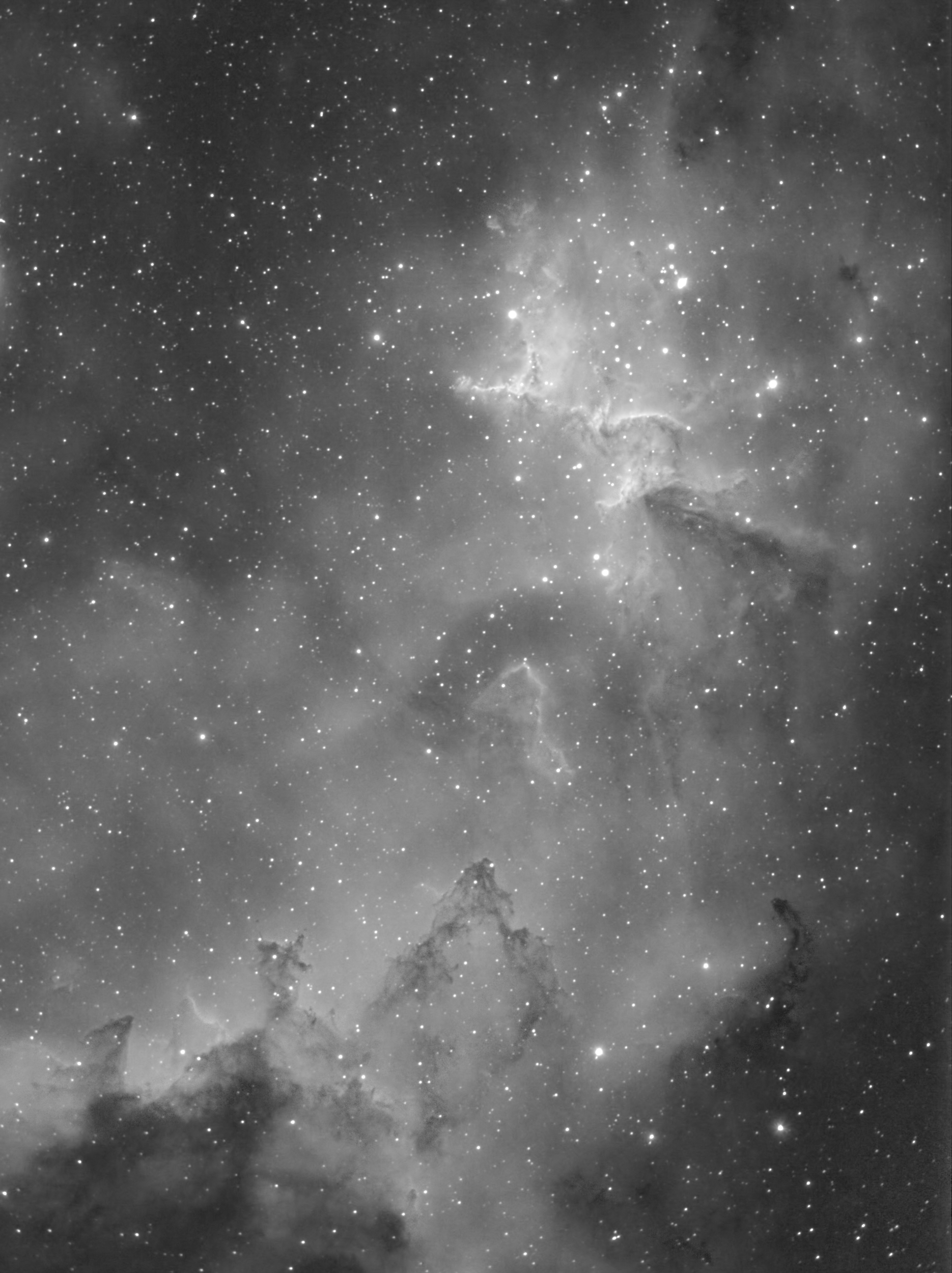 Kommentar: Här körde jag med 12nm Ha-filter och riktade in på Melotte 15 i Hjärtnebulosan, med tanken att senare göra en bi-colour med OIII. Men tycker ändå att svartvitt funkar rätt bra på denna så jag kanske stannar här. Guidat med Nexguide på HEQ5 Pro. Kamerakontroll med qdslrdashboard och arduino intervalometer. Inga darks, flats eller bias. Processad med DSS, PS och Starnet.