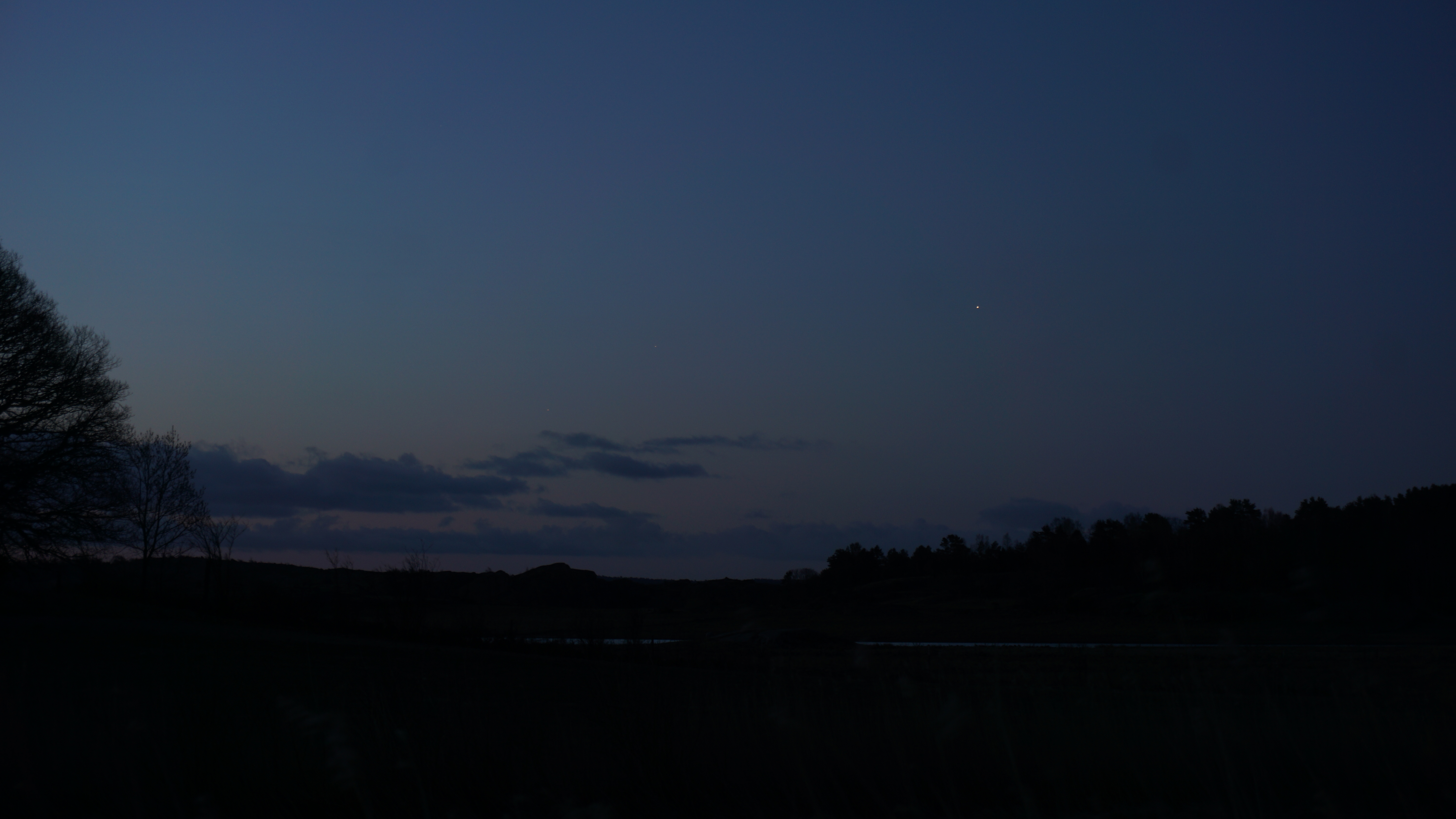 @ jwarell Det var lite småknepigt, dessutom så dök det upp en molnbank vid bästa fototiden. Hade inte det hänt hade jag fått en bättre bild. Se på den här bilden: Man ser Saturnus och Mars betydligt bättre men Jupiter skyms av molnen. En annan bild visar hur det såg ut senare. Man kan skymta Saturnus och Mars på den ljusa himlen där med.