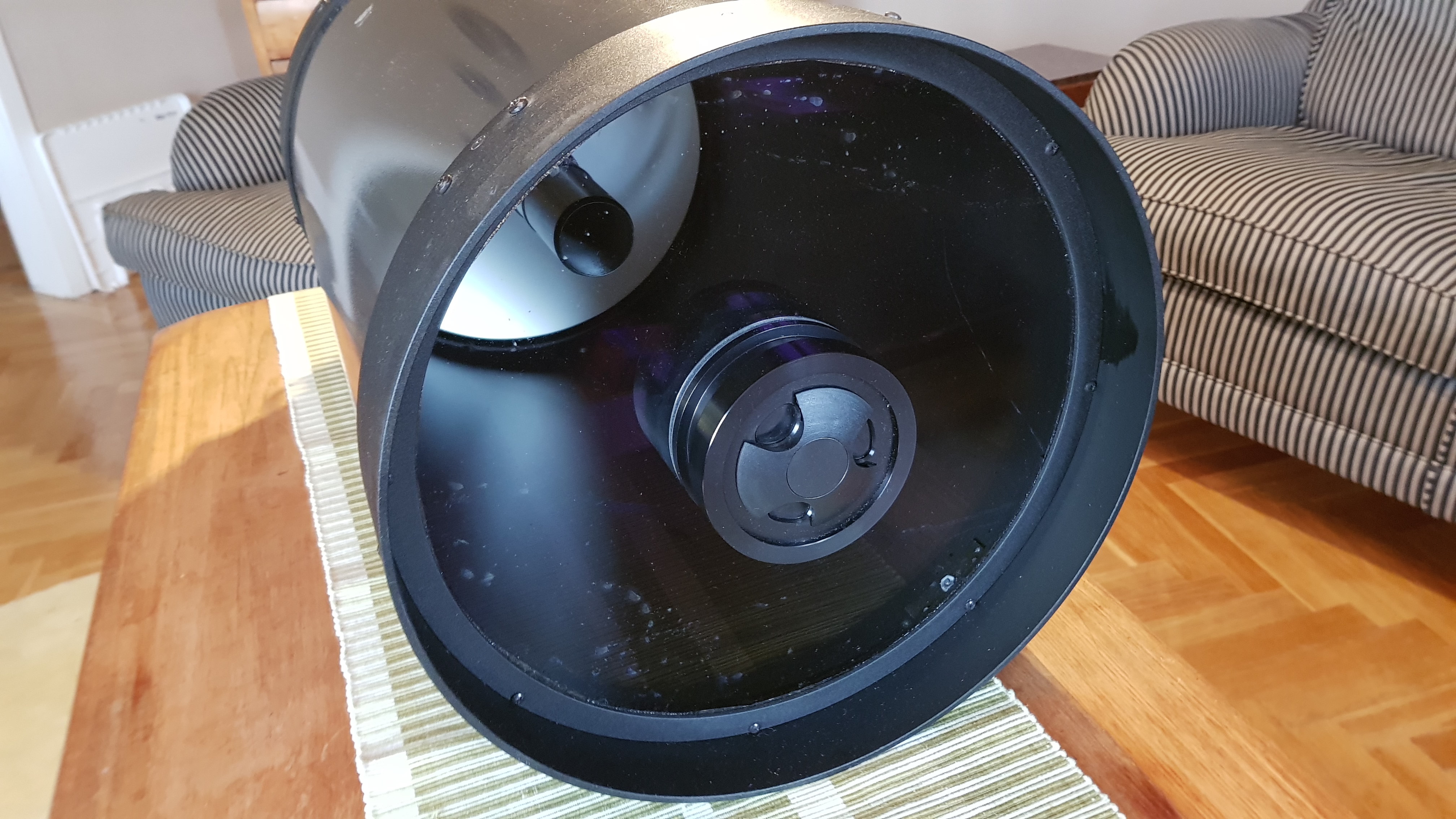 Jag har provat den visuellt under dagtid och optiken påvisar inga defekter som tyder på sprickor eller deformation i korrektorn! Vidare påvisar tuben mycket låg "image shift" (bildförskjutning) vid fokusering. Korrektorn påvisar kondens som torkat på ytan. Med stor sannolikhet går detta att lösa upp efter varsam rengöring! Som sagt påvisar optiken inga tecken på fysiska defekter utan på visar mycket god skärpa och kollimering. Med det som sagts inledningsvis bör köparen vara väl förtrogen med rengöring av SC korrektorplatta samt kollimering av dito optiskt systemet!
