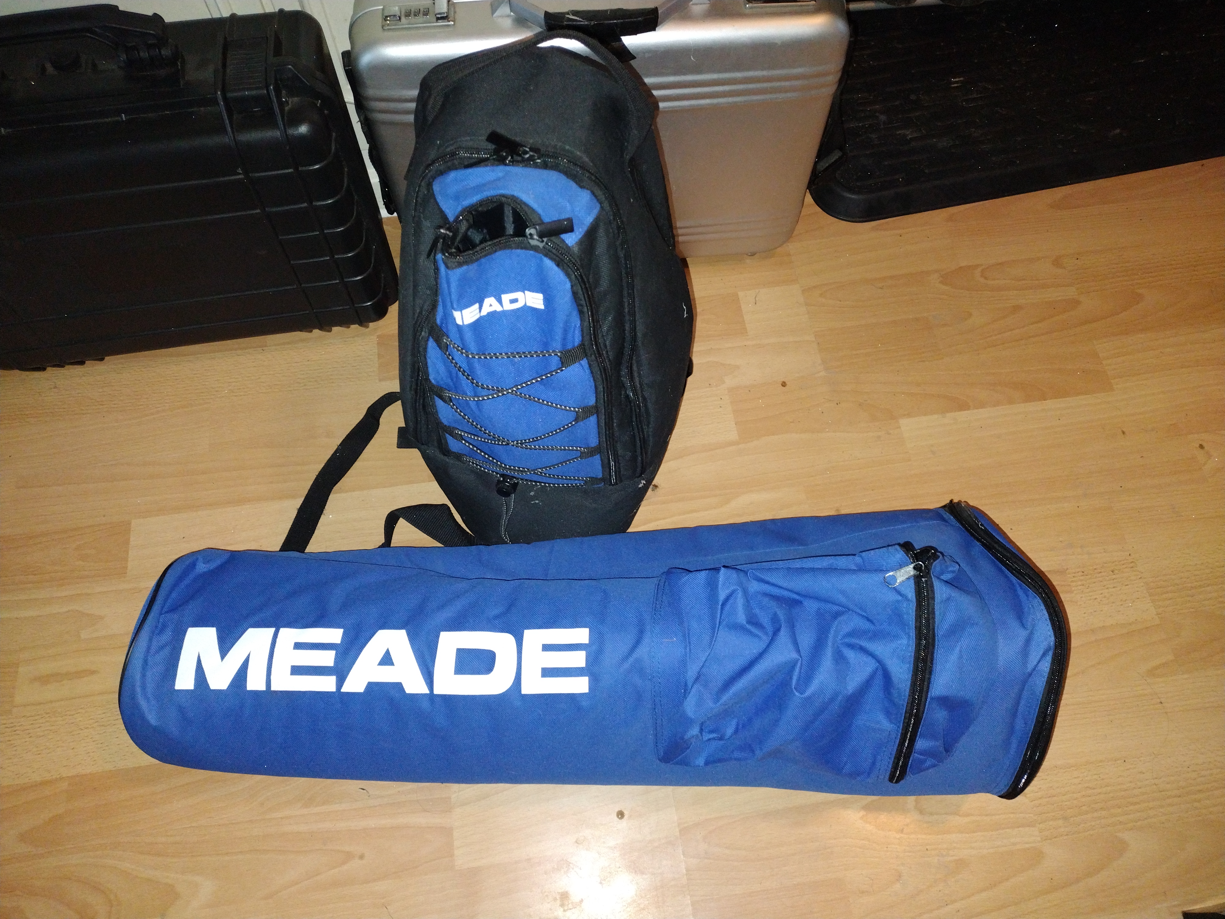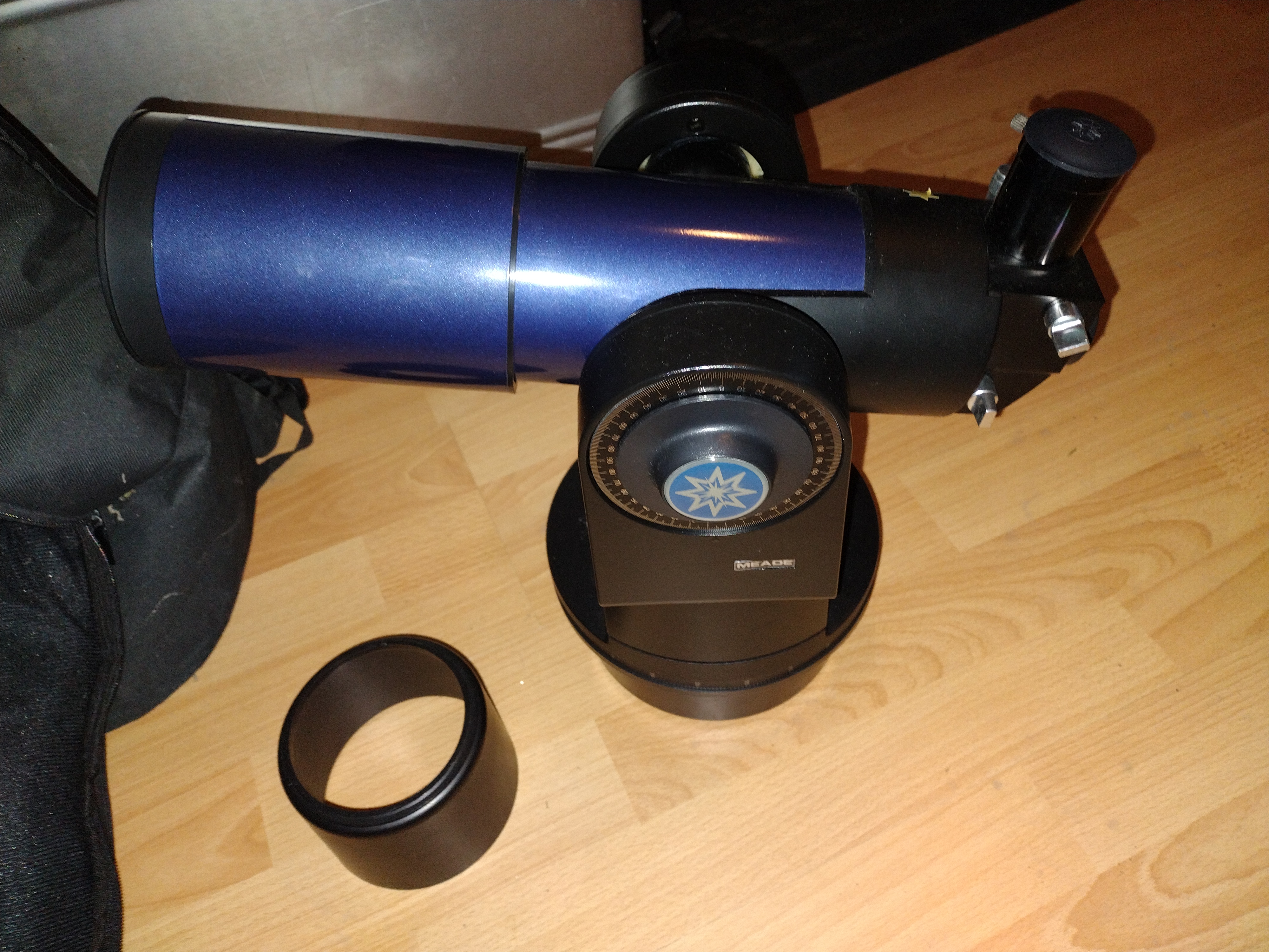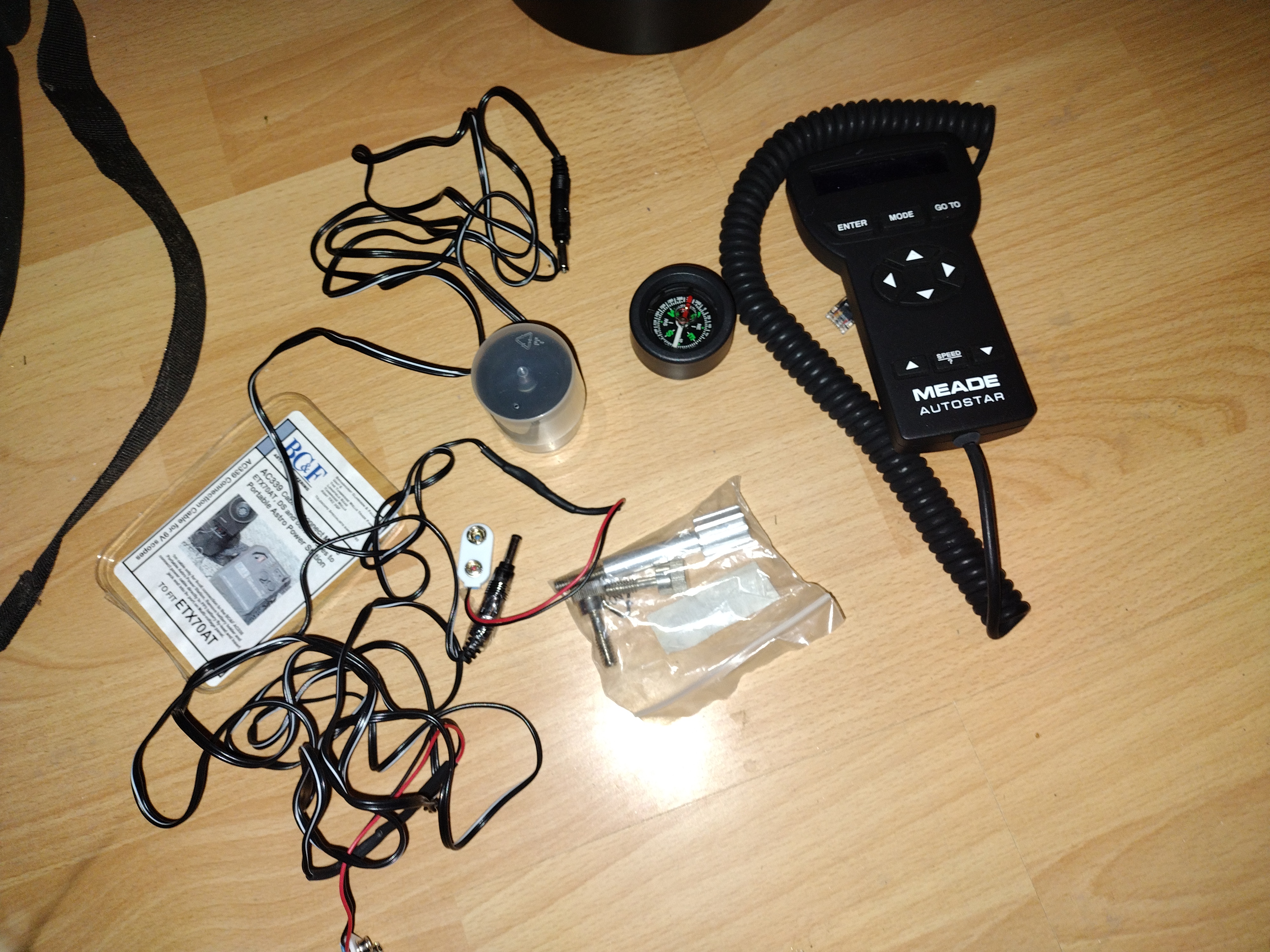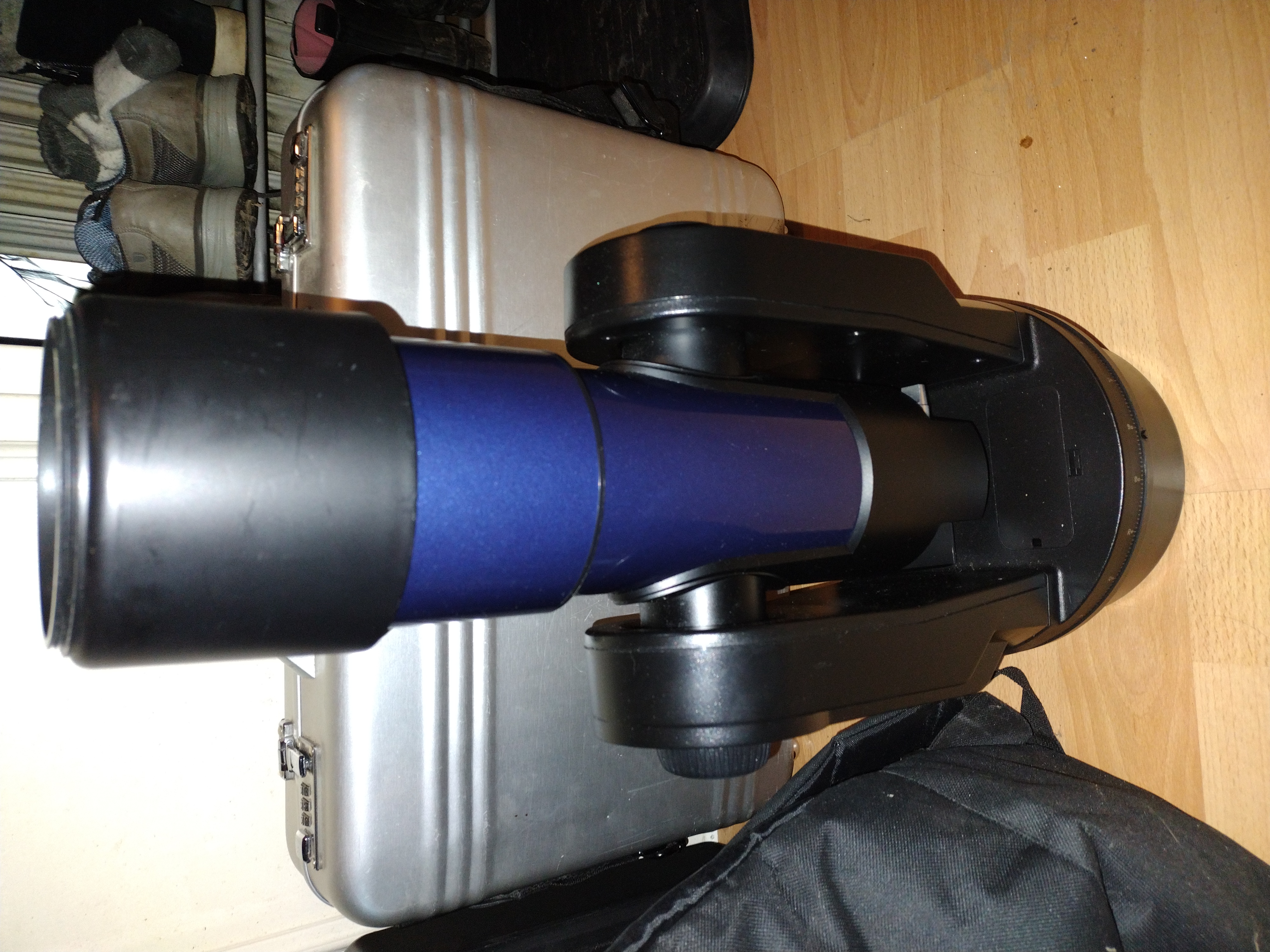 Hej. Dotterns ETX80 ligger i garderoben sedan 4-5 år. Det är självklart lackerat i den vackraste tänkbara teleskopfärgen, Meade-blå. Använts en del, men fortfarande i nyskick (eller näst intill). Stativet har jag inte haft uppe ur väskan på ett tag, men där kan det finnas lite lättare skavanker. Köpte till en vadderad Meade-ryggsäck så både stativ och teleskop har nu väskor. AutoStar GOTO funkar felfritt. Akromat-optiken mycket fint skick. Har för mig att vi även köpte plugg och kabel för cig.uttag. Ska försöka lägga upp lite foton här under dagen.
