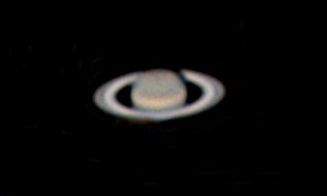 Kommentar: Efter att tittat länge på Mars i natt så väntade jag tills Saturnus kom glidande över trädtopparna 01.33 UT. Den var på ca 15 graders höjd när jag tog den här bilden. Jag hann bara ta två videosnuttar innan det blev mulet. Jag filmade 5 minuter med gain på max och 7,5 FPS, orsaken till den usla ljusstyrkan var dagg på linsen. Jag använde f/25. Jag filmade med IC Capture, Debayrade med Firecapture, stackade med Avistack2 och efterbearbetade med GIMP. Inte lätt att fotografera Saturnus i år på grund av den låga höjden men det blir fler försök senare, helst med mer tid och mindre dagg.