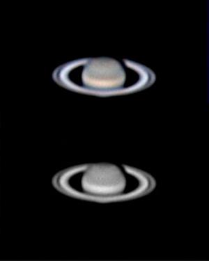 Kommentar: Den här bilden tog jag vid en astronomisk utflykt ut på landet. Tur att jag hade kamera och dator med mig och att batteriet orkade. Jag filmade 5 minuter med 7,5 fps med IC Capture, debayrade med Firecapture, stackade med Avistack2 och efterbearbetade med GIMP. Jag är rätt nöjd med resultat, den låga höjden på Saturnus sprider färgen rätt våldsamt och det är en del pill att försöka fixa det och jag har väl inte lyckats till 100 %. Den svartvida bilden är röd kanal som blev fin.