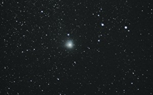 Kommentar: Inspirerad av Staffan Söderhjelm fina bild på kometen, bestämde jag mig för att göra ett eget försök. Första observation och fotografering av en komet någonsin. Den var ju lite blek i okularet, som M31 ungefär och jag är osäker på om jag kunde se någon färgnyans. Har haft problem med stackningen i DSS där jag valde "Comet + Stars Stacking" som alternativ. De ljusaste stjärnorna stackades felaktigt bredvid varandra medan de svagare klarade sig fint. Orsaken var att jag hade för många stjärnor detekterade vid registreringen. Efter att ha dragit ner till 70-90 så försvann probelemet. Slutligen fick jag förskjuta det röda spektrat till vänster föt att kometen skulle få en aning av grön färg... Själva formen på kometen blev konstig också men det får duga för den här gången.